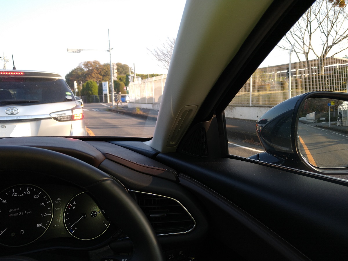 太めの大径タイヤにも関わらず、MAZDA3よりホイールベースを短縮して最小回転半径を5.3mに抑えているので、普段使いの取り回しもそれほど悪くありません。 前方・側方の車両感覚も割と掴みやすいのと、サイドミラーがあまり出っ張っていない、というよりボディー形状が結構出っ張っているからこその全幅1795mmなのでミラーはそれほど出ていない、という言い方が正しいのかもしれませんが、側方も思ったより幅広な感じがしないのもよかったです。