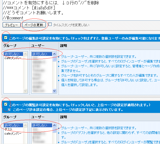その後に「このページの編集許可を有効」をチェックし、編集権限をグループ/ユーザーとも「許可しない」に