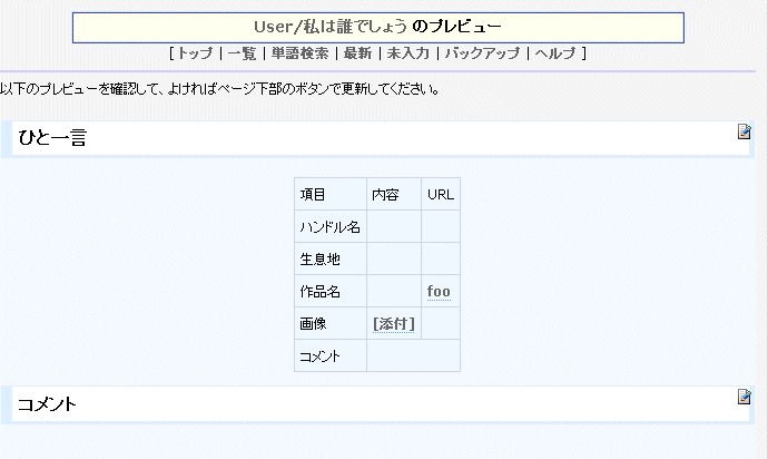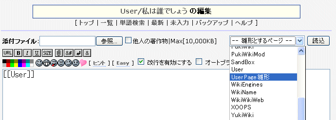 pw-hinagata.gifここで雛形とするページを指定して「読込」を押します。Userページを作成する場合は、「UserPage雛形」です。